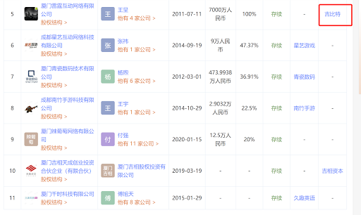 同样,“上游资产”指“一级资产”的资产链开始端,“上游资产”与“下游资产”最大的区别在于“产业结构分析”与“股权结构分析”。以“吉比特”作为demo举例。(注:所有信息取自于互联网公开信息)