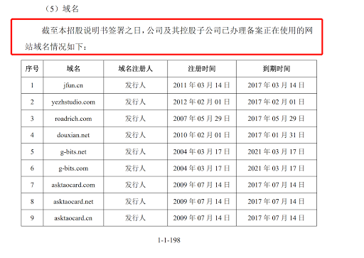 在“吉比特”招股书找明确的写到截至本招股说明书签署之日,公司及其控股子公司已办理备案正在使用的网站域名情况,也就是说这里的内容将会继续扩大目标的“一级资产信息”。而其中许多公司得招股书中,会有大量得资产域名。