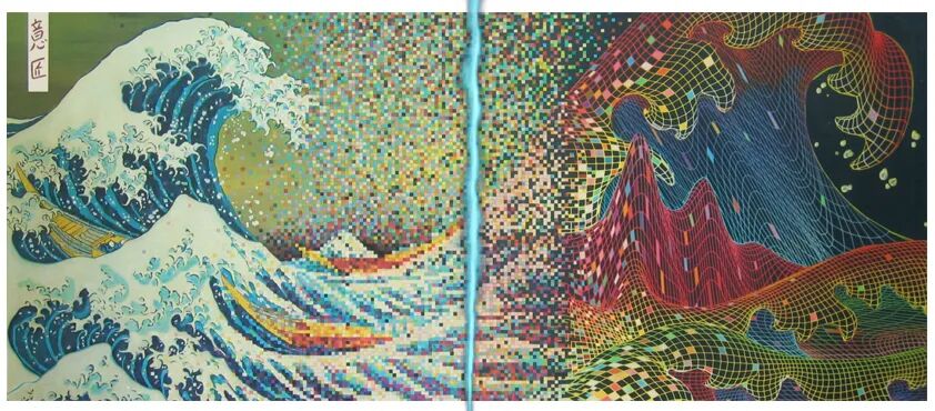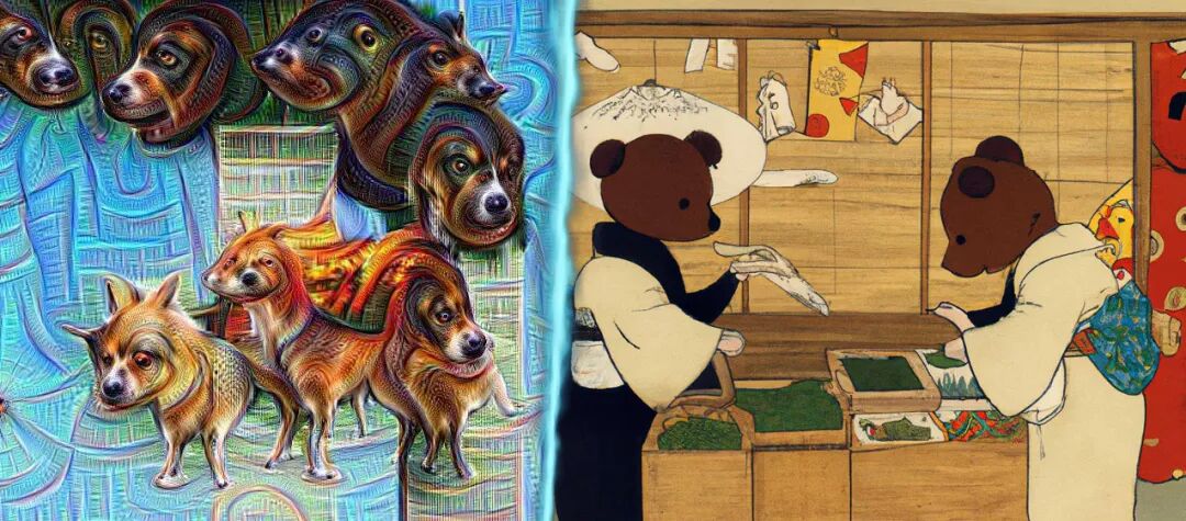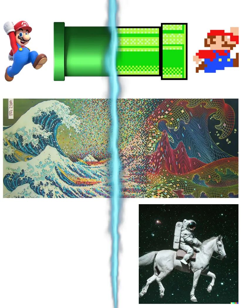 当然,在真正进入元宇宙时代之前,我们还可以用这些独立的“像素、体素物品”做很多有趣的事儿。比如,做一个mini版的赛博空间,在里面搞展览或服装发布会,也就是“虚拟秀场”、“虚拟展会”,或者干脆把现成的博物馆“体素化”。这是我周末(在电脑前吃着零食)逛的 VR 梵蒂冈博物馆说到这,我得强调一下,现实世界的数字化其实有两种方式:除了刚才说的“把物理世界的物体直接变成数字模型”之外,还可以“把现实世界和数字世界连连看”。比如,我在朋友家看到了一个泡泡玛特的玩偶,很喜欢,但不知道叫啥名字,我就可以用“拍照搜索”去电商里找到它。这时你用到的是“图搜引擎”,它的本质就是在现实世界的物体和赛博世界的照片之间建立“勾连”。还有一种更难的情况:我看到路人手里拿的一个玩偶很好看,但社恐的我不好意思叫住他询问或拍照,于是他就消失在人海,我只剩下脑海里的残影。。。我可以在搜索框里写:“蓝白色猫玩偶,手里抱着红色月亮,大笑的表情”。图搜引擎就可以根据“语言描述和图片的勾连关系”找出符合这个描述的商品。(注意:图搜引擎所做的,是真的“找到符合你描述的商品形象”,而不是“匹配关键词”。)这背后用到的是一种非常前沿的 AI 技术——多模态搜索。简单理解,多模态的意思就是它可以把“语言”、“图像”和“它们背后的意义空间”,三者相互勾连。我通过语言描述可以找到图像,通过图像也可以找到语言描述。想想看,如果快进到元宇宙时代,我们眼前的很多东西都会以像素化/体素化的方式呈现。那时,我们想找一件东西,当然没办法用博客时代的“关键词搜索”,而必须描述那个东西长啥样,也就是用到“多模态搜索”了。所以,多模态 AI 在今天看来只是一种搜索场景里的技术,站在未来看,因为建立了从物理世界到数字世界的映射关系,这种技术会成为基石。(这个故事我写在了《我在淘宝买到“生活解药”》里,有兴趣的浅友可以去看。)说到这,你可能已经对“AI 能点儿干啥”有感觉了。不过,咱们想象力的小车还完全没有开上秋名山。说来说去,我们都在围绕*已经存在*的物体讨论——必须在现实中存在这个物体,我们才能用 AI 把它数字化;必须在数字世界存在这个图片,我们才能通过多模态搜索找到它。现在请问:如果世界上压根没有这个东西,它只存在于意义空间,也就是我们的“想象力”中,AI 能把它的实体创造出来么?我们试试看,创造一个想象力允许,但物理定律不允许的东西,比如宇航员在宇宙里骑白马。。。现在,如果你还不知道什么是“AIGC”(AI生成内容),那得赶紧跟上了。就在2022年春天,全世界最魔性的 AI 公司 OpenAI 搞出一个名叫 DALL·E 2 的人工智能,彻底引爆了世界。它可以根据一段文字描述自动生成出(世界上从不存在的)图像。在我看来,这种图像之精美,意境之深远,超过了至少一半的人类艺术家。左边是2015年谷歌推出的 AIGC 程序 DeepDream 的作品;右边是七年之后的 DALL·E 2 的作品。你感受下技术的飞奔。刚才我们不是说到“多模态人工智能”可以把文字和图像和背后的意义相对应么?在这个框架下,只要添加两样小魔法就好:第一,把一般的 AI 模型换成一个“超大规模的 AI 模型”(一般称之为大模型),它的作用是把文字、图像和背后的意义对应得极其精细。第二,“理解一张图片”的本质是把随机性一层层减少,最终坍缩成一个类别;而把这个过程逆向来用,往里添加随机性,就变成“生成一张图片”啦!