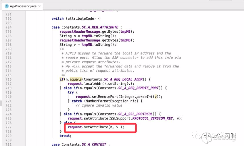 tomcat在接收ajp请求的时候调用org.apache.coyote.ajp.AjpProcessor来处理ajp消息,prepareRequest将ajp里面的内容取出来设置成request对象的Attribute属性