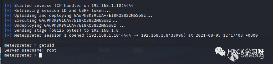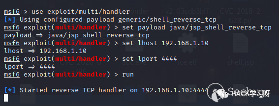 msf开启监听,注意payload使用java/jsp_shell_reverse_tcp