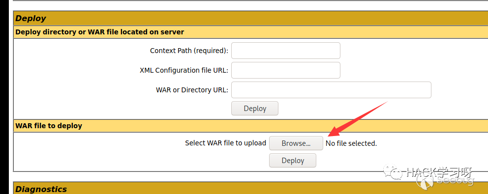 看到这里有一个上传war包的地方,这里很多java的中间件都可以用war远程部署来拿shell,tomcat也不例外
