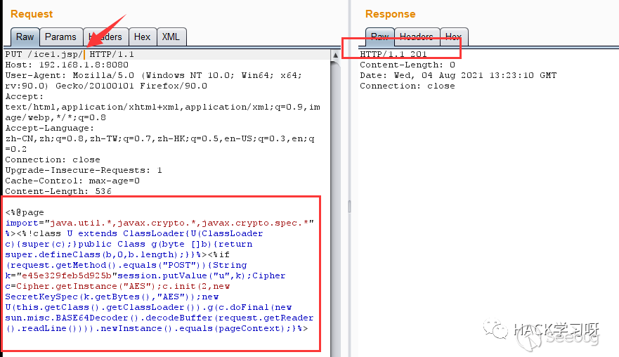 之前说过,使用PUT方法上传任意文件,但限制了jsp后缀的上传,这里首先使用PUT方法直接上传一个冰蝎的jsp上去,发现返回的是404,应该是被拦截了