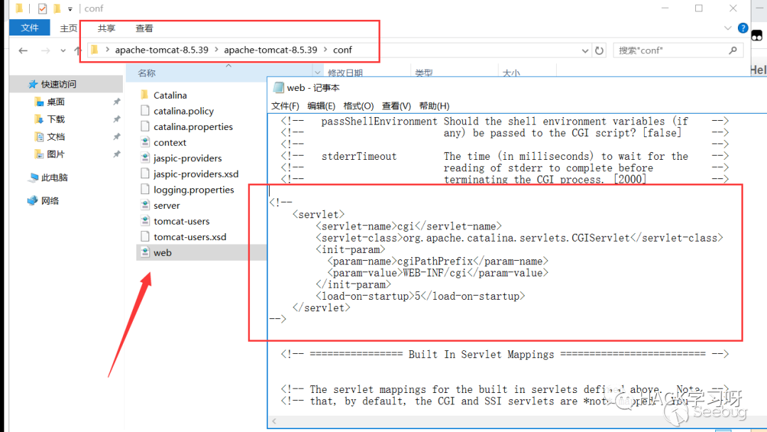 Tomcat的 CGI_Servlet组件默认是关闭的,在conf/web.xml中找到注释的 CGIServlet部分,去掉注释,并配置enableCmdLineArguments和executable