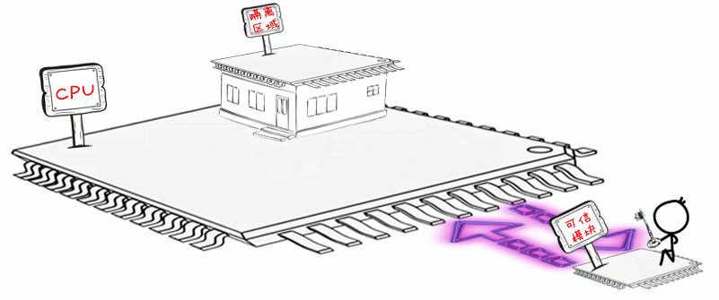 简单来说,HyperEnclave 的原理是酱的:首先,在 CPU 之外,挂上一个名叫 Blade 的国产自研小芯片,这个芯片通过了国家相关部门的安全认证,它不干别的,就负责存储那把安全屋的钥匙。然后,在 CPU 上创建一个虚拟机,在这个虚拟机周围建一道铜墙铁壁,这就是用软件模拟出来的“安全屋”。