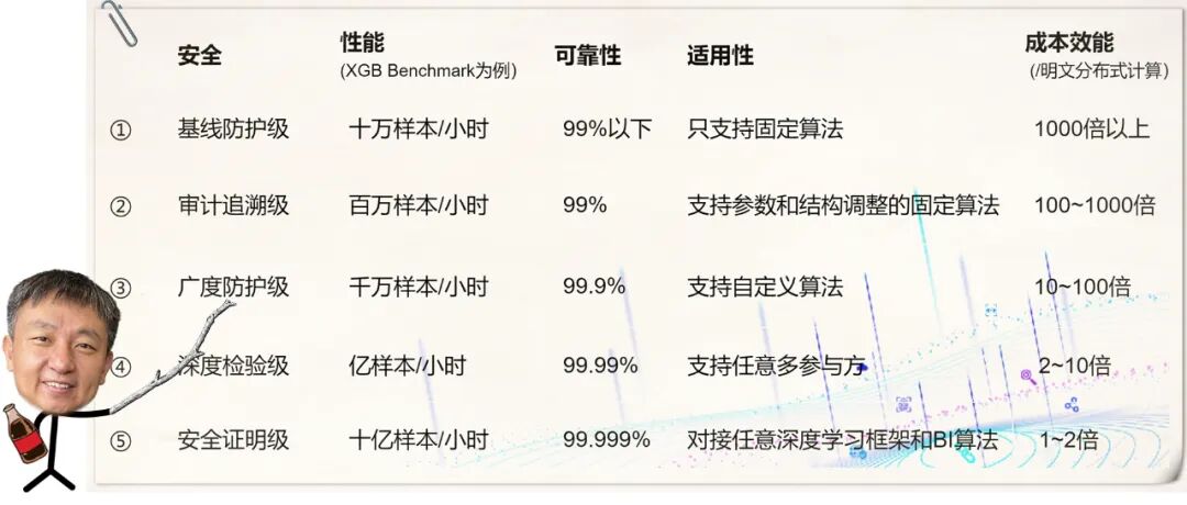“学得越深,反而觉得各种技术都很不错。眼看夕阳西下,恐怕得尽快选定方案!”几个人决定再次去找掌门韦韬,请他做个建议。“其实不必发愁。”韦韬露出艺高人胆大的微笑,“正好最近几日,我也在思考这个问题,独创了一个评价各种隐私计算技术的方法,不妨给各位参考!”韦韬伸出一个巴掌:“评价一个隐私计算,主要有5个方向的指标,分别是:安全、性能、可靠性、适用性、成本效能。”比如“TEE”,虽然它是一个安全屋,也有 HyperEnclave 这类技术保证芯片方不作恶,但谁都没办法排除一种可能,那就是“安全屋”本身存在未知漏洞,理论上,黑客有机会通过破解屋子把里面的信息偷走。(虽然实际上可能性很低)同理,之前说过的“联邦学习”也存在信息熵泄漏的可能。在联邦学习的基础上把关键数据用加密方式保护起来,就改进成为“安全联邦学习”。但即便如此,理论上也没办法完全消除“信息熵泄漏”的可能性。“多方安全计算”由于有严格的数学证明,安全等级就能到4级。由于“联邦学习”和“多方安全计算”都涉及到数据穿针引线一般穿梭,属于“跨网运算”。所以它们对于网络传输的要求高,也会存在性能的瓶颈。目前来看,只能计算百万~千万量级的数据。可“TEE”就不同了。它不需要数据来回乾坤大挪移,闷头在芯片里计算就好了,属于“同网运算”。所以它的计算规模就非常大,可以达到亿级甚至十亿级的数据。“总结一下,不同的计算方案有不同的安全等级和不同的计算性能,几位大侠可以参考以下表格。”韦韬说。“等等,韦韬大侠,你这图的右上角,性能又好,安全又高的技术是啥呢?”周伯通眼尖,指着那个“TEE+Crypto”说。“哈哈哈,被你发现了!最近两年,我们蚂蚁众大侠苦思冥想,世间是不是存在一个既安全又性能良好的隐私计算路线呢?于是我们把 ‘信人’和‘信天’的两大流派双剑合璧,独创了一门‘可信秘态计算’,简称 TECC!”韦韬说。请各位想象一下,你们把《九阴真经》传送到安全屋后,不马上进行计算,而是把《真经》再一页页拆开,用多方安全计算的模式在安全屋中计算。这会是什么效果?第一个效果:万一整个系统中有一部分“安全屋”被欧阳锋撬开,他拿到的也只是数据的碎片,无法还原出《九阴真经》的原文。第二个效果:由于所有安全屋都放在一起,郭靖从这个道场走到那个道场不用花很长时间,信息传输的开销也会大大减少,从而非常接近明文计算的效率。