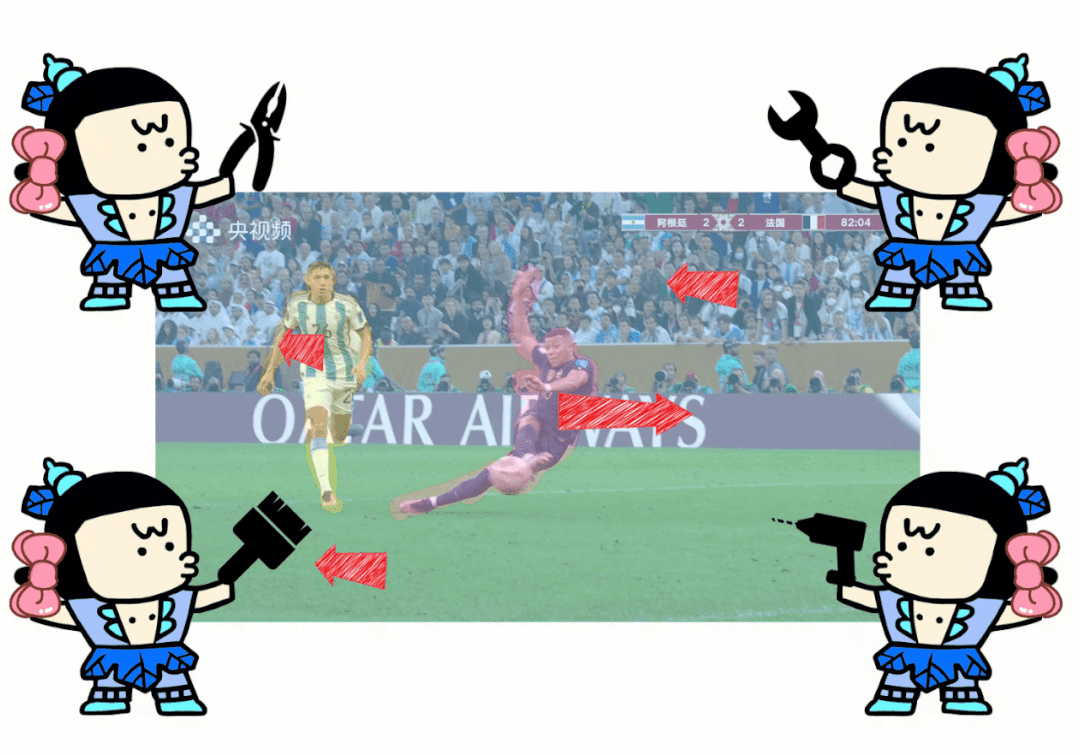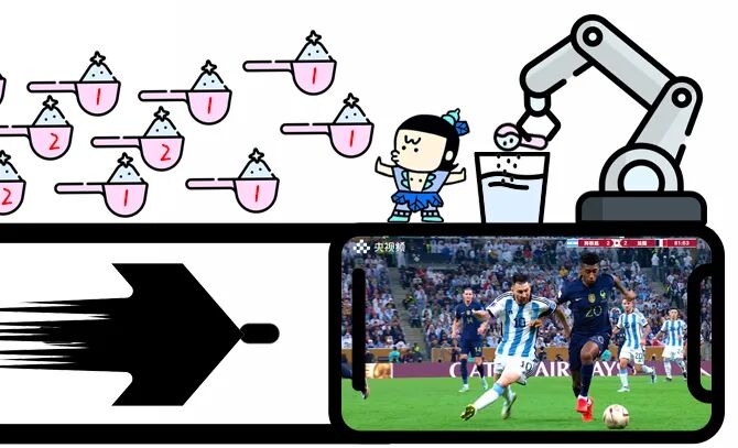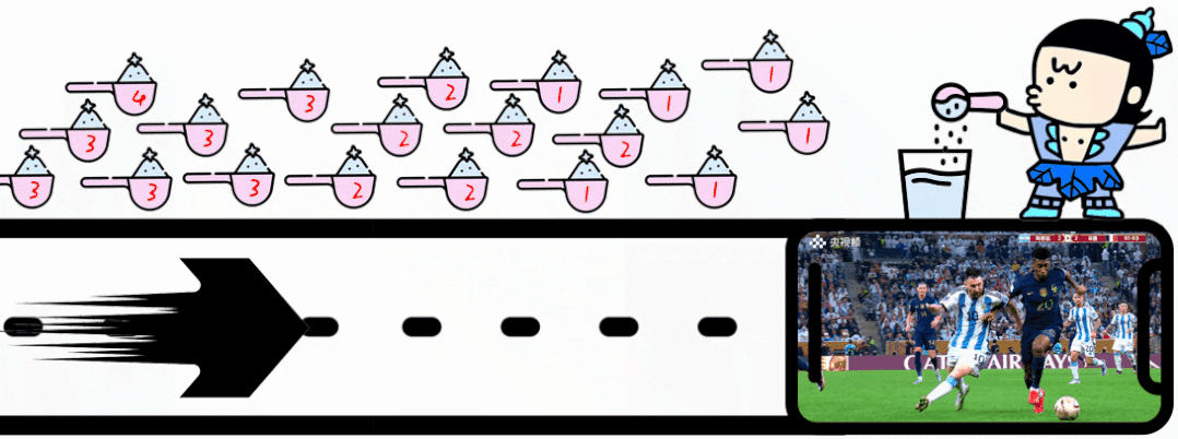 街上只有流浪狗狗,和我手冻得厉害,只好两手“接力”举手机。街灯昏黄,映着手里的绿茵场格外鲜亮。那一刻我又做了个决定:这一晚对自己好一点,不在乎流量,一狠心把清晰度调到了最高。当时的我,并不清楚画面背后究竟对应着什么技术参数,只有一个感觉:真XX清晰。清晰到可以看到草坪上的草尖。看着球员眼神里闪烁的光,看台上翻滚的旗帜,突生感慨,此时此刻仍旧有很多人在热烈而无畏地战斗。如果把镜头拉远,我眼前的万丈沟壑是否也会成为岁月里的轻描淡写呢?第83分钟,浅野拓磨攻进了反超的一球,日本2:1绝杀逆转。队员们抱在一起,肆意欢庆从强敌嘴里抢来的胜利。回家的路上,我想:要是有朝一日春暖花开,有机会走出家门,我一定得找到抖音的老师傅,问问他们是怎么把转播画面搞得这么清晰的。(一)直播,就是从一个水桶倒进另一个水桶,再倒进下一个水桶 胖虎不一样。他面前排着五个屏幕——电视、电脑、iPad、两部手机。。。原来,胖虎身上有个“特殊使命”,他是抖音转播世界杯的“画质调优”老师傅(之一)。面前几个屏幕上虽然播放的是同一场球,但“来源”却不同:有抖音的,有CCTV5的,还有几个友商的。他的目标很简单:这么多转播画面,抖音的必须是最漂亮的,没有之一。我惊了,原来我在街头看那场比赛时,岂止是球员在场上玩儿命,在转播画面背后,老师傅们也是玩了命在较劲。。。真是一个“卷”到不行的世界呢。。。首先,是钱的事儿。2022卡塔尔世界杯,其实是抖音第一次试水转播世界级体育赛事。为了从央视买下转播权,花了老鼻子钱,这要是播出去没人看,那钱不是白花了吗?更重要的,是脸的事儿。抖音的祖传艺能就是短视频和直播。要是直播小姐姐美美哒,直播足球却很拉胯,被大家吐槽,老师傅的脸往哪儿搁?以后在道儿上怎么混?!不对啊,大家播放的不都是从卡塔尔传回的现场画面么,怎么还能分出来谁好谁坏呢?浅友们都参加过公司团建吧?有一个经典的游戏是酱的:每队出几个人,手里拿着水桶一字排开,水桶一个比一个小。团队的任务就是,把最大的水桶装满水,然后依次往小的水桶倒,最后一个人把水倒进计分桶。规定时间内,谁把水运输得更快、更多,谁就赢了!从卡塔尔现场,到你手机上的画面,中间是要经过好几个“水桶”的,粗略来说有以下四步:1、从真实的世界的“大海”进入现场摄像机的“大桶”。众所周知,真实世界的光影非常细腻,世界杯哪怕用顶级的设备,都只能记录比赛现场信息的九牛一毛,就像弱水三千,只取一“大桶”饮。为了保证现场画面能第一时间跨越半个地球来到中国,几乎只有一种方法——卫星传输。可卫星说到底只是天上的一个“铁疙瘩”,身轻体柔干不了重活儿,每秒钟传输信号的能力是有限的,它相当于一个“中桶”。所以,必须把现场画面压缩成卫星能hold住的大小,对于这次世界杯来说,就是 4K 画面。(北京冬奥挑战过8K的极限)卫星左手接收卡塔尔信号,右手就马不停蹄地转发给央视。央视收到画面后,会兵分两路。一路就是在 CCTV5 或者央视频直接播放,这个暂且不讨论;另一条路就是把信号通过高速网线传给抖音这样的二级转播商。注意,“二级”指的是转播权,不是说画质。具体来说,这里央视会把信号原封传给抖音,就像是接了一根水管,只要水管不抖动,抖音接收到的信号和央视收到的100%相同。4、从抖音的“中桶”到用户的“中桶”、“小桶”、“脸盆”、“水杯”。在看球的时候,咱们的手机屏幕千差万别,网络带宽也有大有小。所以抖音必须得把 4K 画面压缩成不同版本的“水流”,用户有多大桶,抖音就给多大流。这,就是在看直播时我们可以选择的“4K”、“1080p”、“720p”、“480p”之类的档位。我们今天的故事,其实都发生在“第四步”里。之所以讲这么多,主要是想让你感受一下全貌:视频信号在传输过程中,并不岁月静好,而是步步惊心。1、几乎每一步都需要“压缩”——只要有压缩,就有画质损失。2、每两步之间都要有传输——只要有传输,就可能有延时和卡顿。