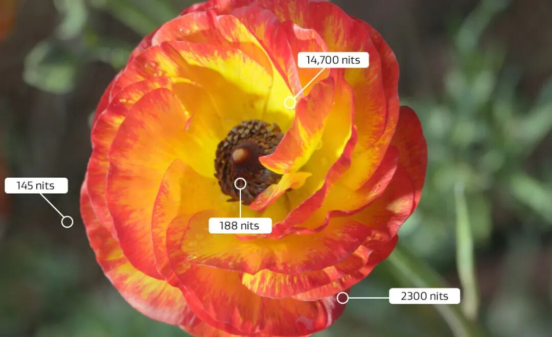 就拿一朵花来说,各个部位的亮度差异也很大。尼特(nit)是标定亮度的单位。问题来了呀,一个只能显示到100尼特的屏幕,让它播放1000尼特的视频,那臣妾是断然做不到的。(只能拼了老命把超出亮度的像素点全按照100尼特来显示,花白一片。。。)SDR,也叫标准动态范围,画面里所有的像素都控制在0-100尼特之间。