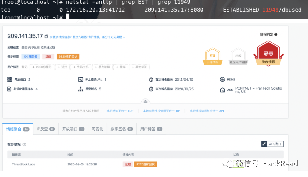 查看kdevtmpfsi进程的网络连接,发现同样连接了矿池在进行挖矿,如下:![]()