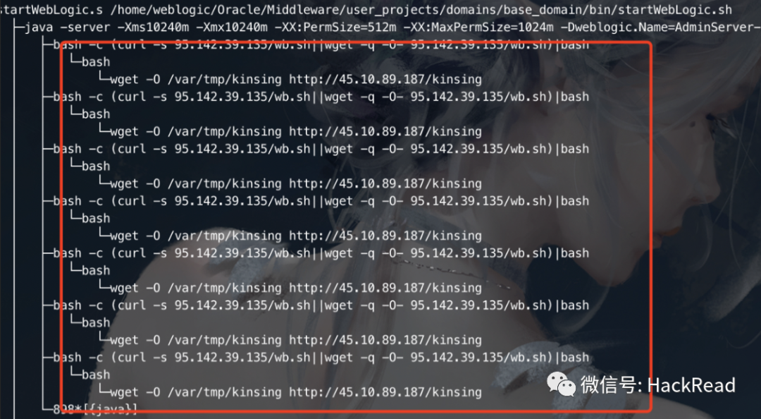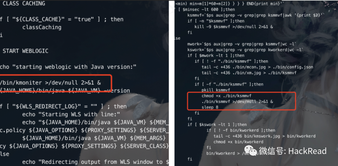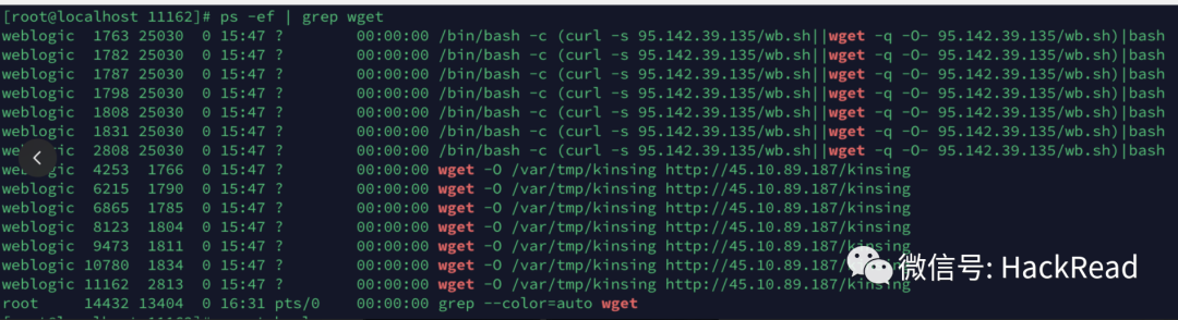 删除恶意程序文件/tmp/kdevtmpfsi和/var/tmp/kinsing本来以为事件到此可以写报告交付了。谁知道第二天用户又反馈应用无法打开了。尴尬到脚趾抓地。。。第二天挖矿木马重新启动,查看进程发现是通过weblogic用户进行程序下载和执行的。还好我留了个心眼。(第一次处理时应用方采用root用户启动的weblogic而挖矿程序也是使用root用户运行的,处理过后建议他们使用weblogic用户启动weblogic中间件后发现此痕迹,进而判断该挖矿程序是通过weblogic程序死灰复燃的)检查后发现weblogic启动脚本被植入恶意代码。如下所示导致启动业务时,挖矿木马再次被下载至本地运行。如下所示:临时备份删除后并将startWeblogic.sh中恶意代码清除,后续建议重新校验weblogic应用文件的完整性,确保无其他未发现的挖矿木马残留文件。删除后weblogic路径下恶意文件后,重启weblogic观察2小时左右未发现挖矿木马再次运行。作者:QS_永夏 原文地址:https://www.freebuf.com/articles/network/280004.html