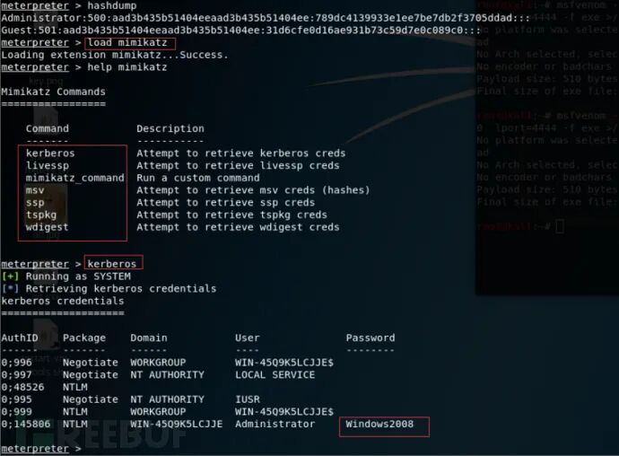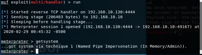 kali监听端口获取反弹shell,出现meterpreter模块代表获取成功,可以输入getsystem来提升权限