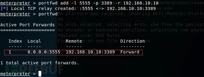 靶机3389端口转发发送到本地的5555端口portfwd add -l 5555 -p 3389 -r 192.168.10.10 (模拟目标主机)