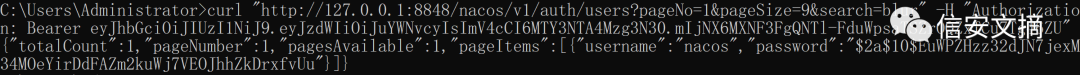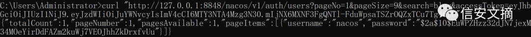curl "http://127.0.0.1:8848/nacos/v1/auth/users?pageNo=1&pageSize=9&search=blur&username=nacos&password=nacos"accessToken、Authorization则是直接的JWT token。