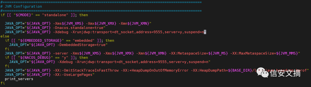 docker run -d --env PREFER_HOST_MODE=hostname --env MODE=standalone --env NACOS_AUTH_ENABLE=true --env NACOS_AUTH_TOKEN=SecretKey:e472c13e-a568-47cd-bb49-c15e253f62e9 -p 9555:9555 -p 8848:8848 nacos/nacos-server:v2.1.0进入docker,开启调试,修改启动脚本bin/docker-startup.sh为如下: