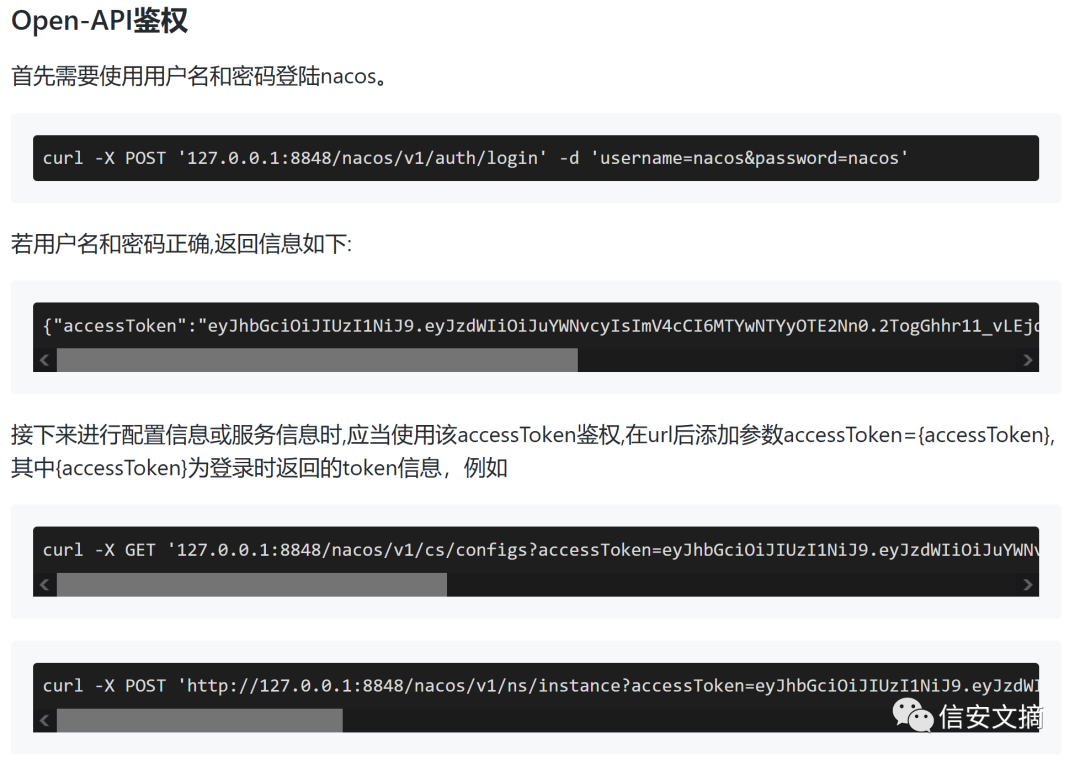docker run -d --env PREFER_HOST_MODE=hostname --env MODE=standalone --env NACOS_AUTH_ENABLE=true --env NACOS_AUTH_TOKEN="VGhpc0lzTXlDdXN0b21TZWNyZXRLZXkwMTIzNDU2Nzg=" -p 9555:9555 -p 8848:8848 nacos/nacos-server:v2.2.0根据官方文档,使用用户名、密码认证成功后,会返回一个jwt的accessToken,后续就可以携带该accessToken请求其他需要鉴权的api。