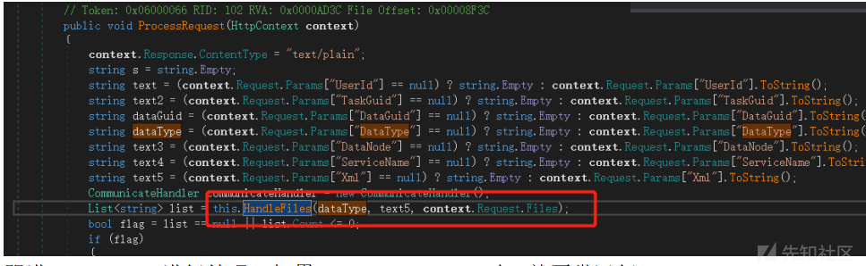 找到ProccessRequest接收请求,可以看到获取了一堆参数后(初始化),后进入了HandleFiles方法,