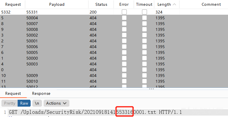 这种类型一般以20210917xxxxx这种格式,xxxx应该为毫秒级别的数字,我们可以直接使用Burp进行爆破跑,4——6位还是可能跑的出来的,再多就跑不出来了。