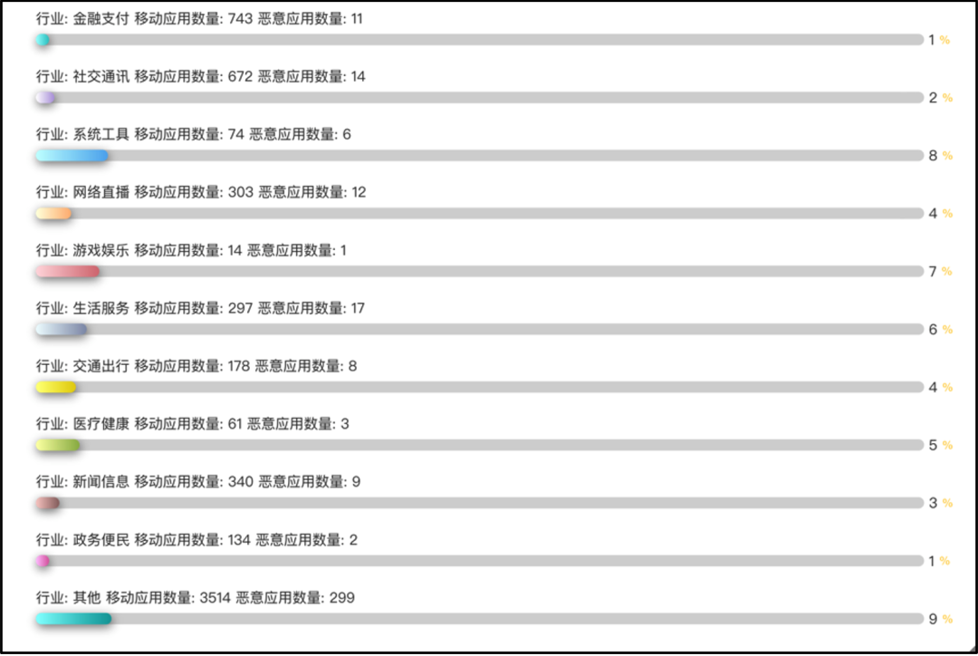 截止202301月底,通过潮启移动端安全管控平台共监测到山东省移动应用数量为11145款(不含历史版本),通过对移动应用行业分布数据追踪发现,目前山东省移动应用行业数量排名靠前的为生活服务类,约2452款,较12月份新增4款;社交通讯类约1463款,较12月份新增3款;金融支付类约966款,较12月份新增1款,新闻信息类约526款。