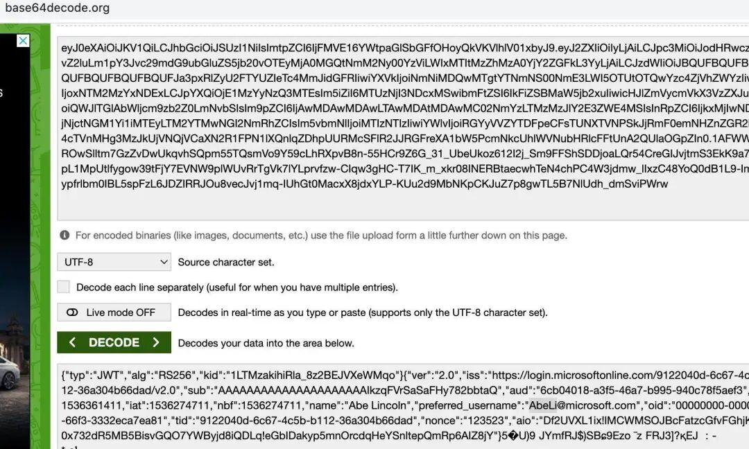 然而,一些JS文件不需要身份验证就可以访问。测试显示,该应用程序使用了安全登录后通过Microsoft SSO系统发送的JWT令牌。在后端机制上,存在一个安全错误配置,即不检查是否为特定的应用程序生成了JWT令牌。相反,它接受任何具有有效签名的JWT令牌。因此,使用来自微软网站的JWT令牌示例如下: