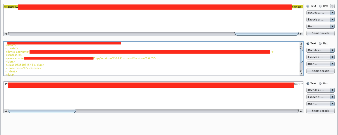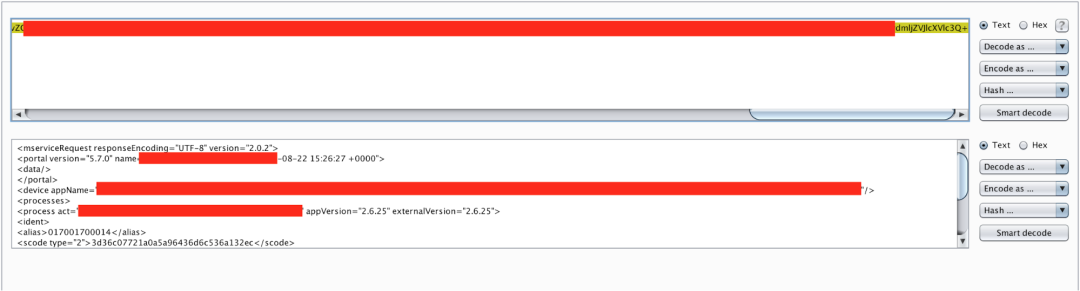在此情况中,应用程序通过 base64 编码的 XML 请求向 HTTP 发布数据上发送所有请求。在登录机制上,它将用户名作为参数别名发送,将密码作为scode发送。scode 参数内的值已进行哈希处理。分析显示,它使用了所提供密码值的 md5 值。请求中还有另一个有趣的标志:scode 有一个属性,其类型值为 2。
