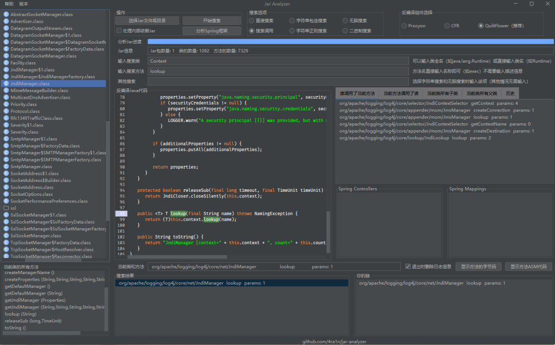 一个用于分析jar包的GUI工具,尤其适合从事代码安全审计。可以在同时分析多个jar文件,可以轻易地搜索目标方法。支持反编译字节码并自动构建类和方法之间的关系,帮助Java安全研究员更高效地工作。