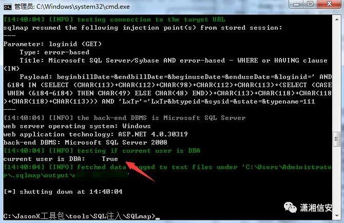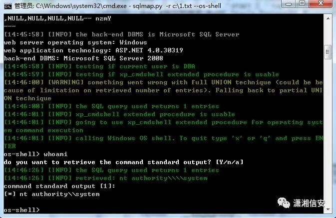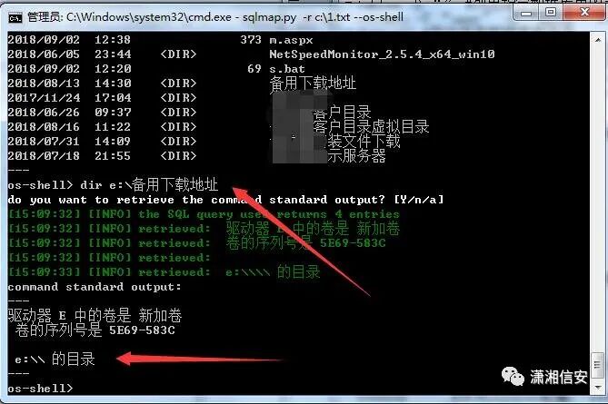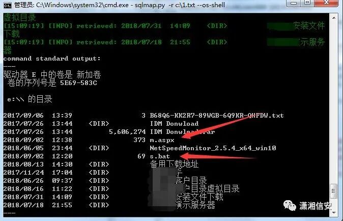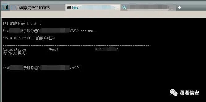 现在我们查看一下是否下载成功,在sqlmap里面执行dir e:\接下来在sqlmap下面执行e:\s.bat,会显示文件复制成功,已经把后门从e\下面拷贝到他网站根目录下了。然后菜刀执行 net user 发现已经可以返回了,但是还是无法添加管理员账号因为上面有eset杀软,用exp提权或者用wce、mimikatz去读取管理员密码是不可能了,各种exp上去全被干掉。最后我的思路是这样,搞一个免杀后门,然后用bitsadmin下载免杀文件到对方的磁盘根目录下,然后sqlmap运行这个免杀文件,上线到msf后直接获取管理员密码。