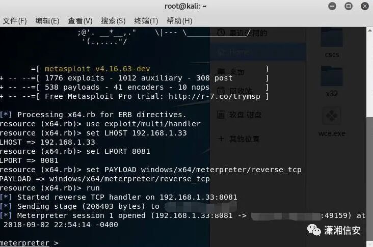 然后msf做好监听,准备接收反弹回来的shell吧。监听好了以后直接在sqlmap里面执行e:\m.exe