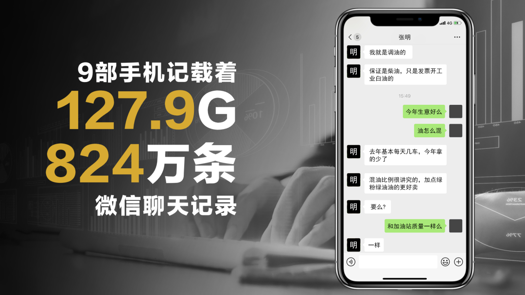 9部手机记载着127.9G、824万条微信聊天记录,海量数据在技术部门的支持下,被成功恢复。电子证据清楚地显示着张明联络上家采购、私下混油调色、拉拢下家销售、指使送油工逃避检查、腐蚀公职人员等往来细节。这些证据真实、客观地再现了制售伪劣成品油的全过程。