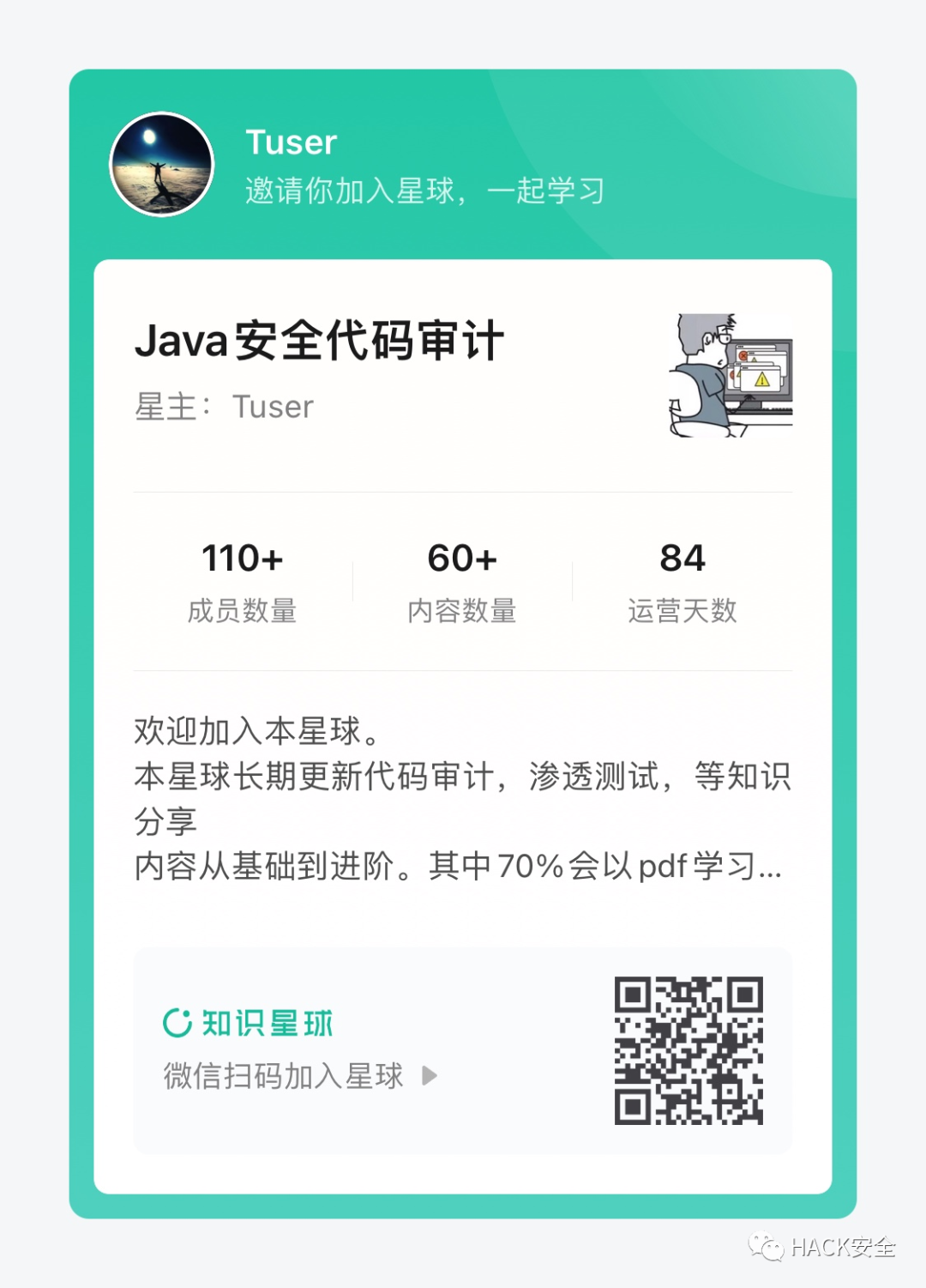目前星球人数在100+,是一个新建的星球。初衷就是打造一个一起学习代码审计的圈子