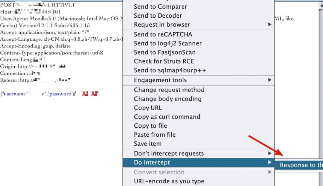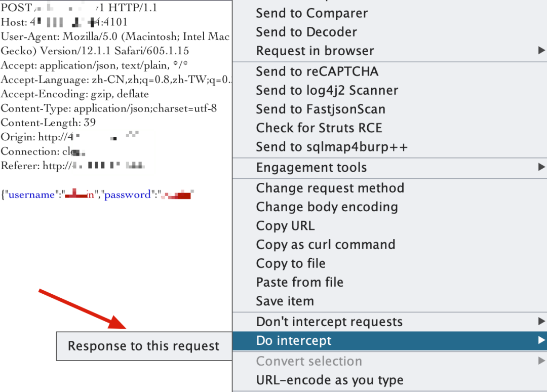 再次登录,随意输入用户名、密码,截取请求包,拦截响应数据。
