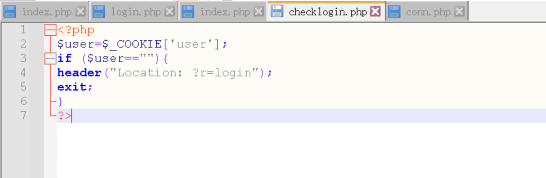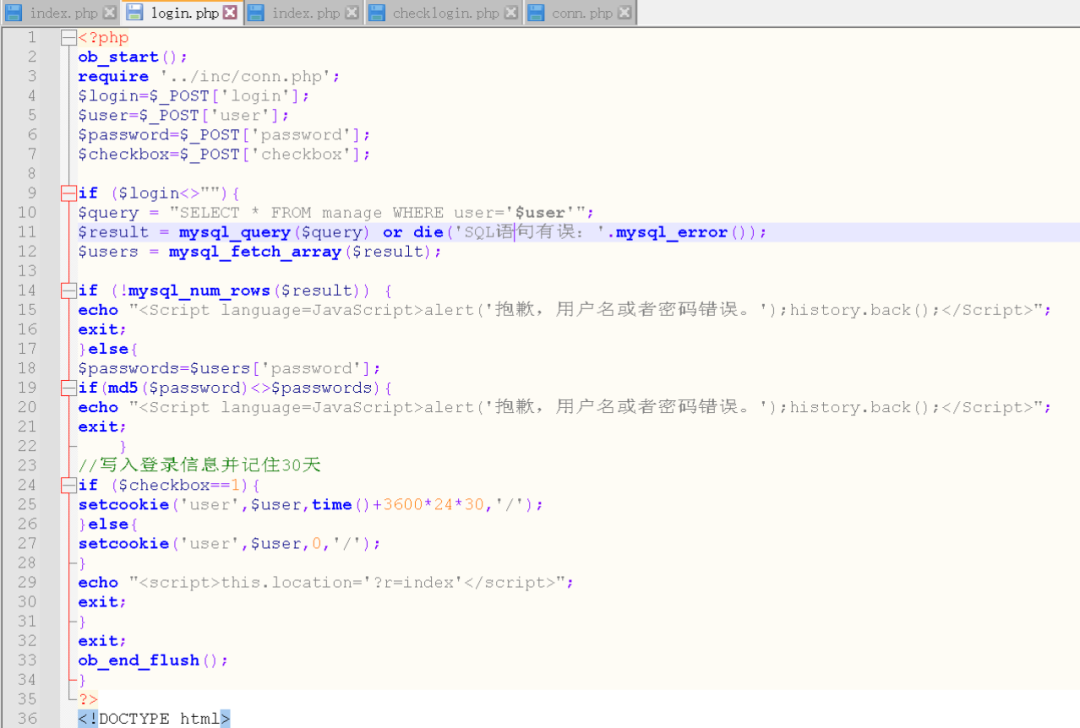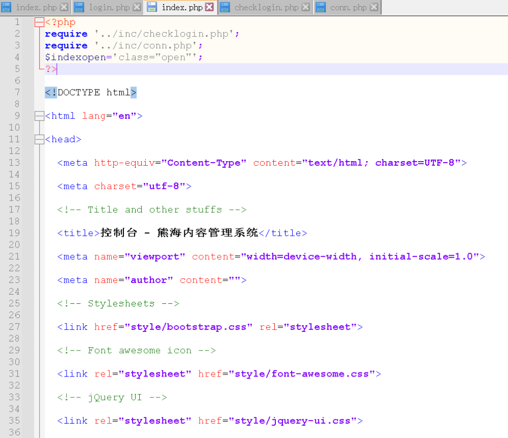 登录后的index.php文件中包含checklogin.php文件,这个文件是用于验证用户是否登录的脚本代码文件。