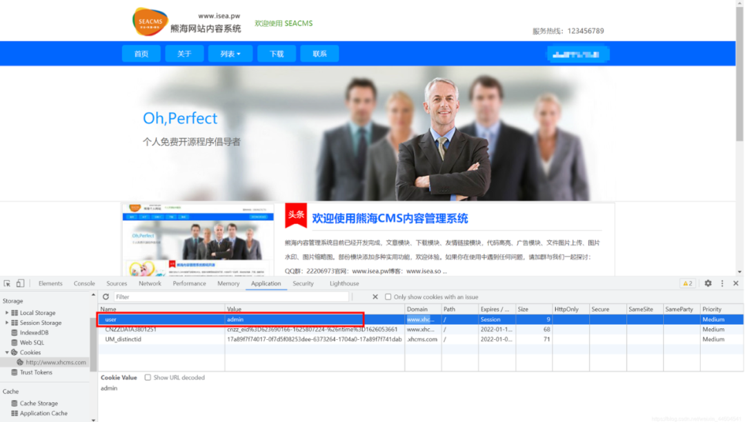 正常登录该CMS,在登录后的cookie中,有个变量user,该变量值为登录后的用户名,并且之后对页面的所有操作都会在cookie中携带有这个cookie变量。