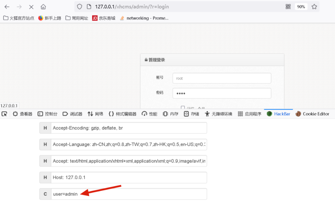 针对以上验证机制,借助HackBar直接访问登陆后的地址,修改cookie,看看是否能成功登录。