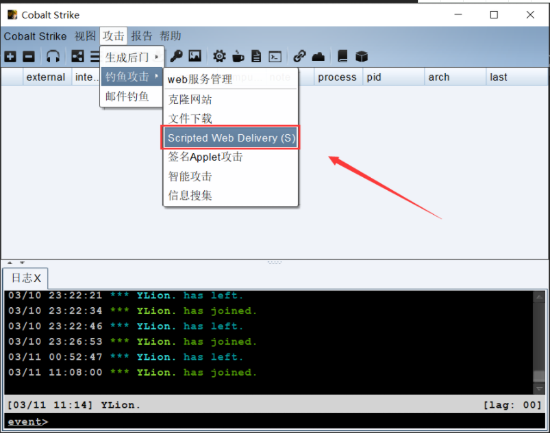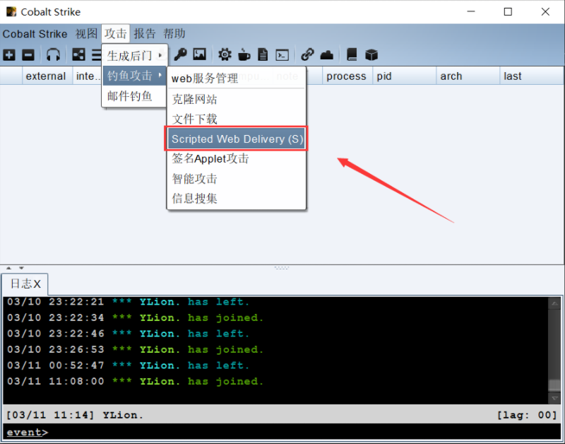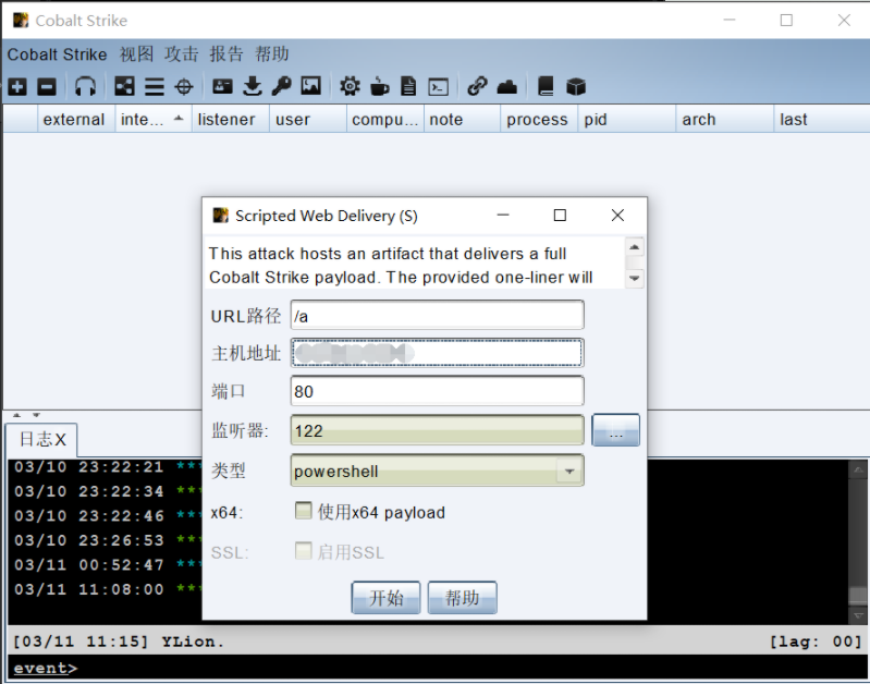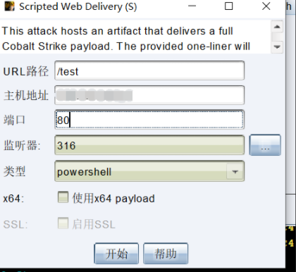 Cobalt Strike -> 点击attacks -> web Drive by -> scriped web Delivery