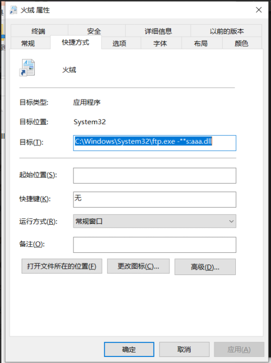 快捷方式的起始位置留空,目标为:C:\Winodws\System32\ftp.exe -""s:aaa.dll