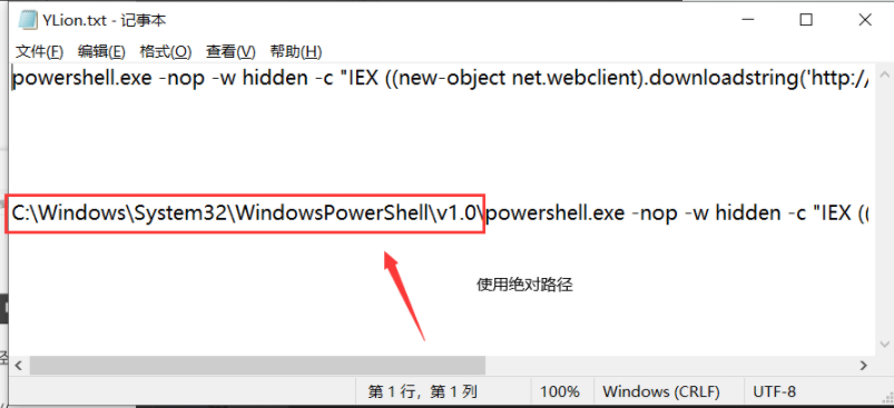 将powershell恶意代码放入进行修改,将代码最前端添加绝对路径
