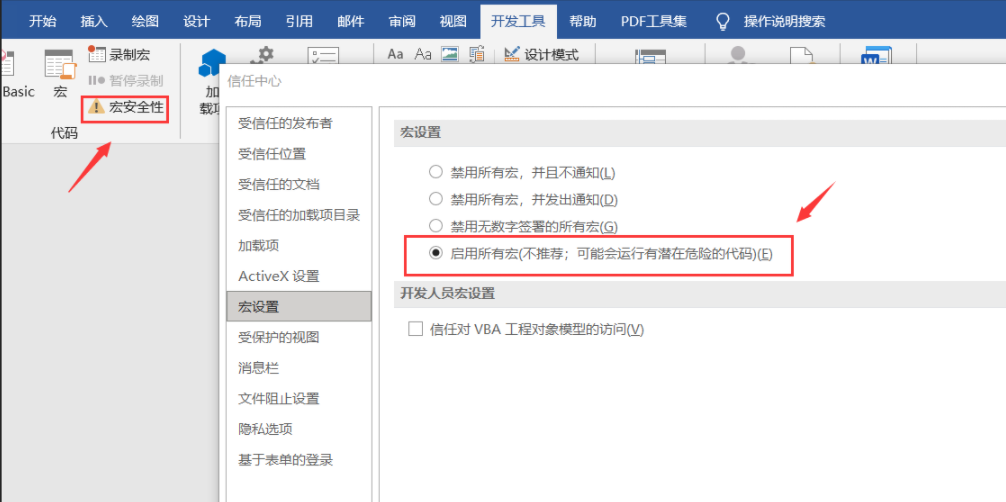 首先在word选项中开启开发工具