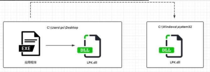 如下面图片中的,LPK.dll是应用程序运行所需要加载的DLL,该系统文件默认在C:\Winodws\system32路径下,但由于windows优先搜索当前路径,所以当我们把恶意LPK.dll放在应用程序同一路径下,便会被程序成功加载,从而执行恶意操作