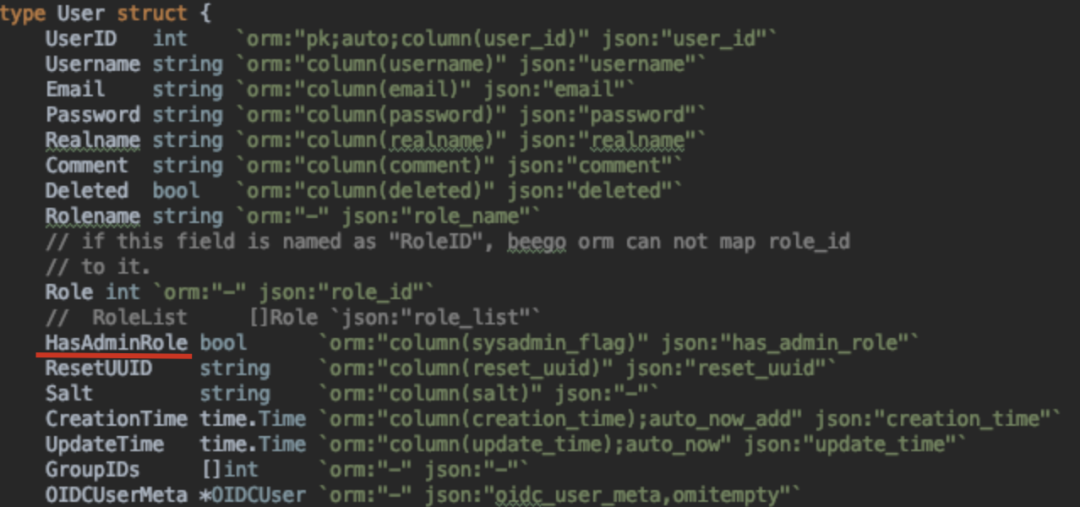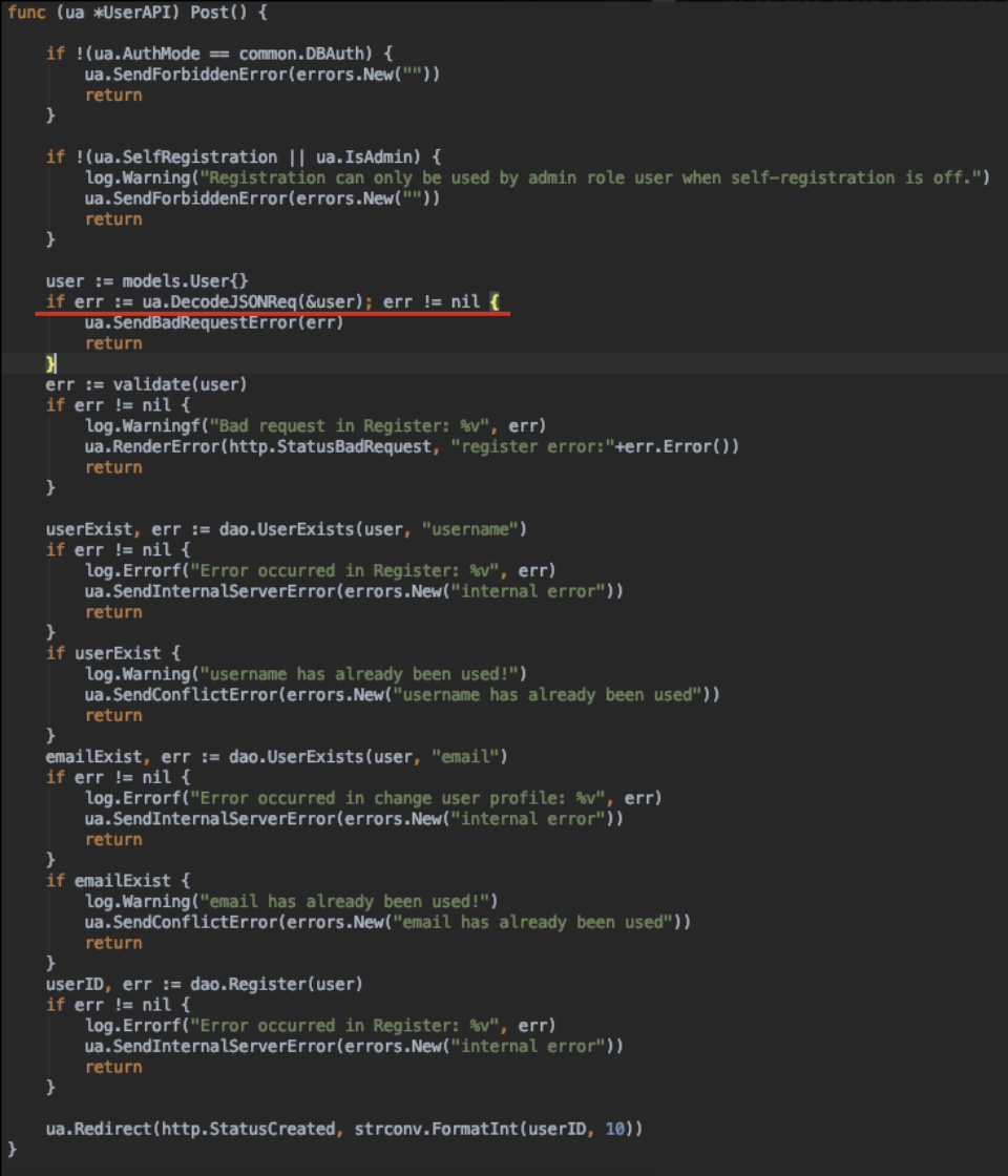 漏洞代码位于user.go的第317行“if err := ua.DecodeJSONReq(&user); err != nil” 这段代码将用户的post的数据转换为user结构。