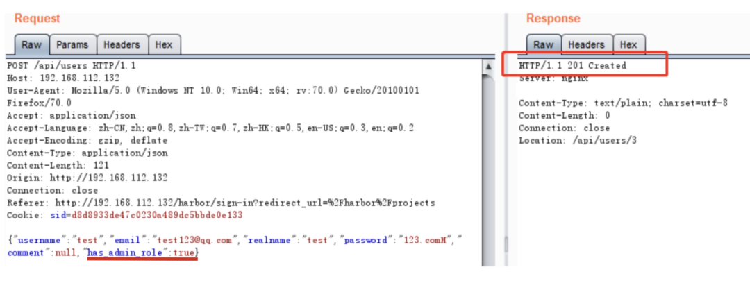Harbor源代码的User结构有很多属性,其中HasAdminRole这个属性用来区分用户是否为管理员,值为Bool类型,控制这个字段就可以利用此漏洞。访问“/api/users”这个api,并且发送相应POST请求就能注册新用户。