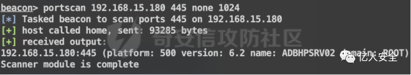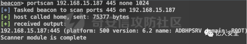 在域中,默认域用户是可以登录到除域控以外的所有主机。当我们得到其中一个域用户的账号密码,所以我们可以利用该域用户与其他主机建立IPC连接,然后让其他主机进行SMB Beacon上线,于是批量扫了下445开放的主机