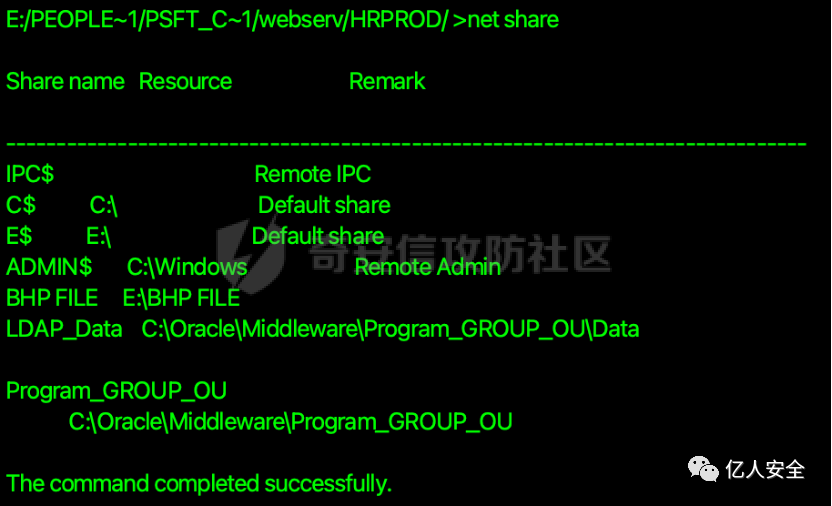 默认共享是为了方便管理员远程管理而默认开启的共享,我们通过IPC连接可以实现对这些默认共享的访问。可以通过net share命令查看,前期信息收集时,就已经查看过当前主机是开启了默认共享的。
